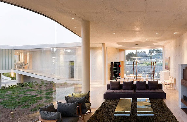 El sitio y la casa están compuestas juntos como un solo espacio continuo, fluyendo como un recorrido con movimiento de espiral y centrada en un jardín parcialmente cercado.